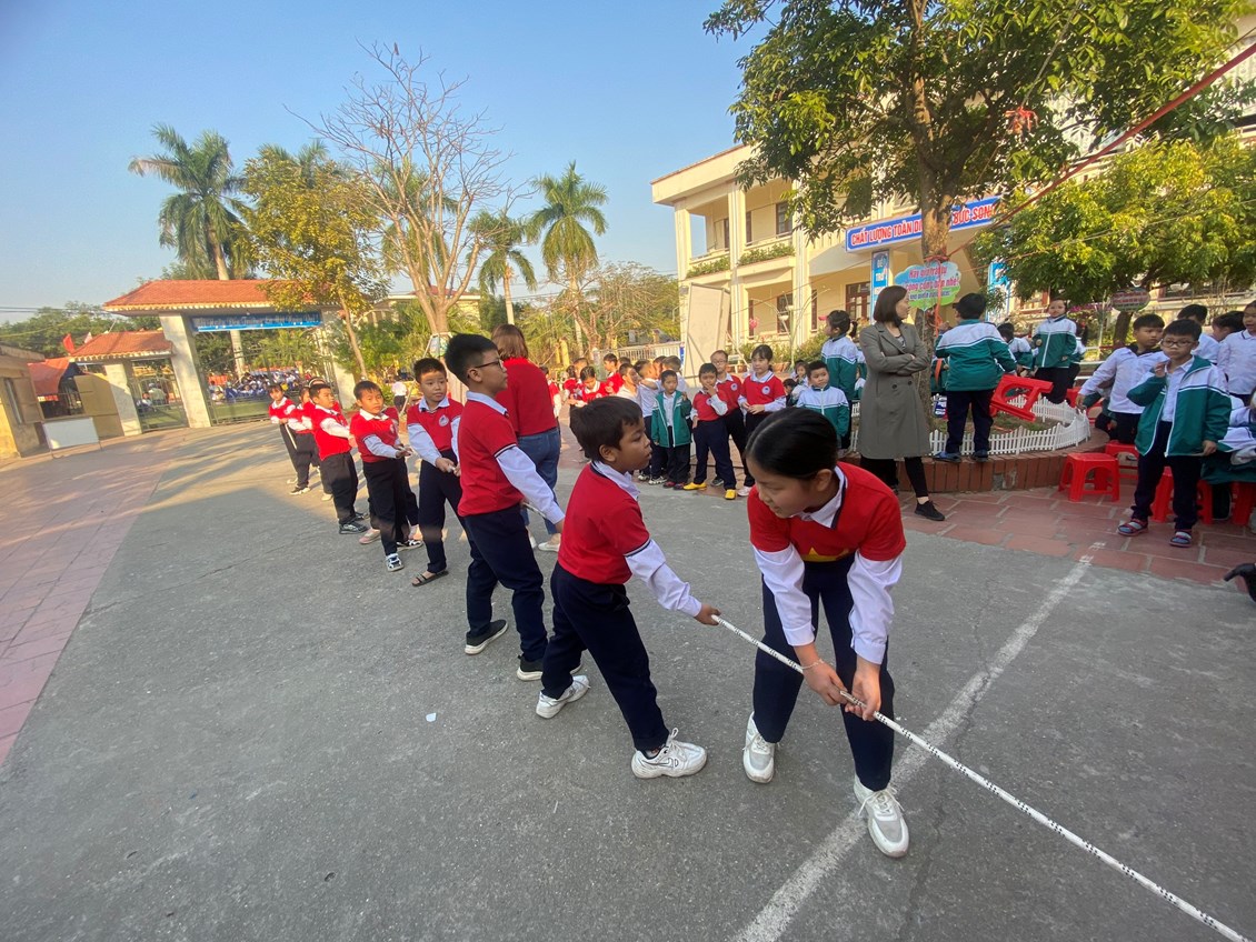 Tiếp theo là phần thi kéo co. Mỗi lớp sẽ có 1 đội 5 nam và 5 nữ (mỗi đội 10 em). Các lớp trong khối sẽ kéo với nhau.