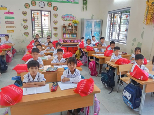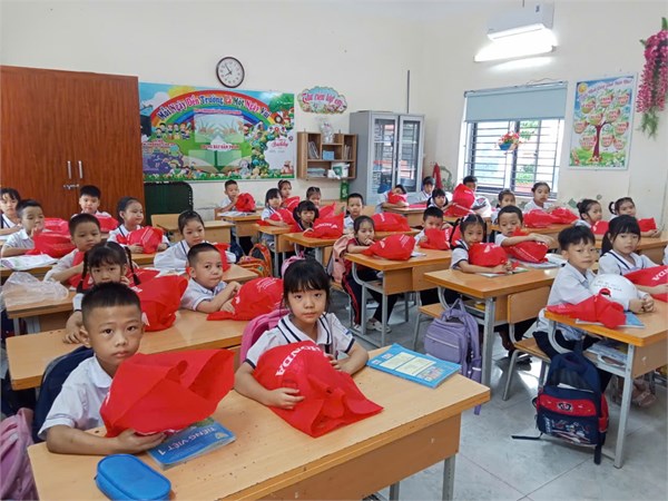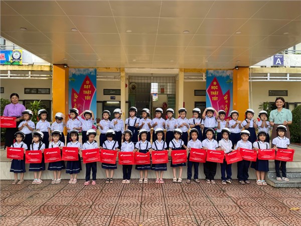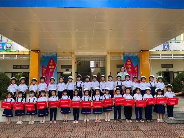 Ảnh HS lớp1 nhận mũ bảo hiểm của công ty Hon-đa